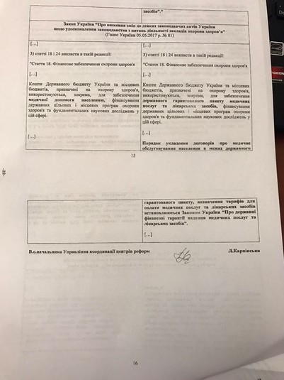 Раніше навколо медреформи точилися палкі дискусії між урядом, зокрема, МОЗ, та комітетом з питань охорони здоров’я. Та представлений урядом проект медичної реформи був підтриманий на Нацраді реформ. Президент Порошенко закликав парламент розглянути доопрацьовані проекти до завершення поточної сесії. І на спільному брифінгу із Уляною Супрун голова комітету з питань охорони здоров'я Ольга Богомолець наголосила, що на Нацраді реформ у законопроект були запропоновані деякі зміни, і був знайдений компроміс. «В цьому законопроекті зафіксовані значно більш реалістичні терміни виконання, зафіксована можливість пілотного втілення: не відразу закривати всю країну, а пробувати в пілотному регіоні чи в пілотних закладах», - зазначила вона. В перебігу узгодження із законопроекту, як розповіла депутат, були вилучені питання медстрахування - щодо цього будуть розглядати окремий проект.