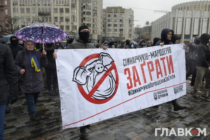 О 13:30 колона вирушає на Банкову. Попереду їде «звукомашина» з піснями, на кшталт «Вставай» Океана Ельзи, саму колону очолюють люди з транспарантами, на яких - заклики посадити за грати «Свинарчуків-мародерів».