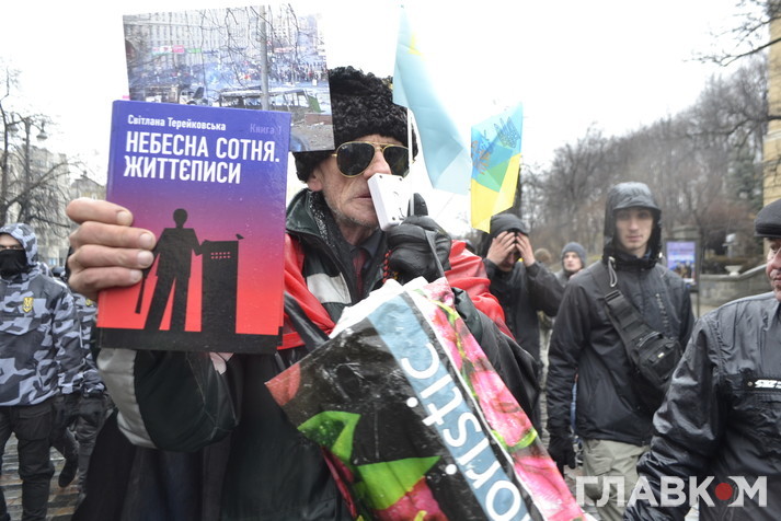 Серед натовпу також видніються сотні представників силового блоку «Нацкорпусу» - «Національних дружин», а також людей з жовтими пов’язками, які символізують підтримку добровольців на війні.