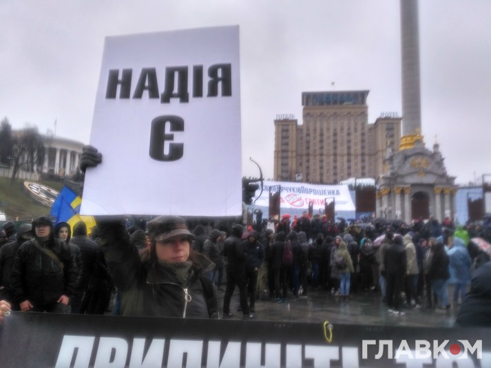 Під час майже усіх виступів біля сцени з піднятим плакатом «Надія є» стояла сестра арештованої народної депутатки Надії Савченко - Віра Савченко.