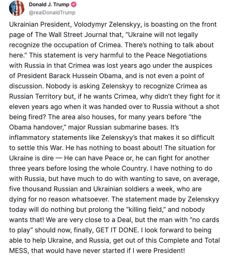 У соцмережі TruthSocial Трамп написав, що Зеленський нібито хвалиться на першій сторінці The Wall Street Journal, заявляючи, що «Україна ніколи не визнає окупацію Криму на законних підставах». «Ця заява дуже шкодить мирним переговорам з Росією, враховуючи, що Крим було втрачено ще роки тому за часів президента Барака Хусейна Обами, і він навіть не є предметом обговорення. Ніхто не вимагає від Зеленського визнати Крим російською територією, але якщо він так хоче повернути Крим, чому ж Україна не боролася за нього 11 років тому, коли його просто передали Росії без єдиного пострілу? До того ж, ще задовго до «передачі за Обами», там базувалися стратегічні російські підводні бази», – зауважив президент США.