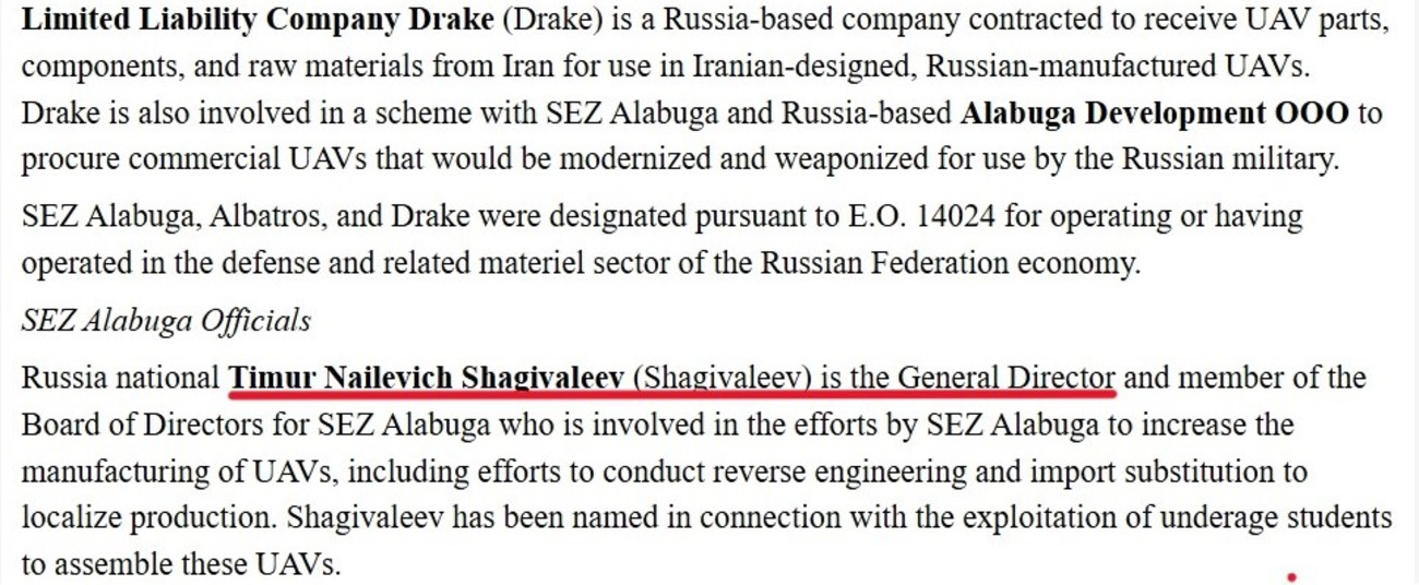 Генеральний директор ОЕЗ «Алабуга» Тимур Шагівалєєв, у репортажі називає підприємство «найбільшим заводом у світі з виробництва ударних безпілотників».