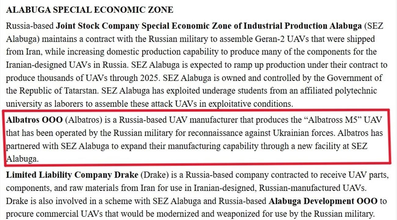 «Альбатрос» фігурує в санкційних списках – зокрема, у санкціях, запроваджених урядом США у 2024 році. У документі Мінфіну США зазначалося, що ця компанія «сприяє військовим зусиллям Росії, виготовляючи БПЛА за іранською технологією».