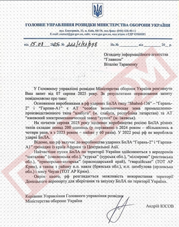 Почнемо з ексклюзивної інформації. У відповіді на запит «Главкома» керівник Головного управління розвідки Міністерства оборони України Андрій Юсов повідомив: на початок серпня 2025 року Росія щоденно виготовляла 200 одиниць різних безпілотників. У порівнянні з 2024 роком виробництво дронів збільшилось в чотири рази, а з 2023 роком – майже у 60 разів!!! До слова, у 2022 році Росія зовсім не виготовляла ударні дрони.