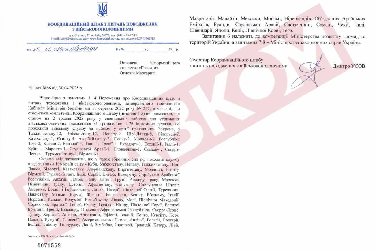 Станом на 2 травня 2025 року, у спеціальних таборах для утримання військовополонених в Україні перебуває 81 громадянин із 26 іноземних держав. Вони проходили військову службу за наймом в армії РФ. Такі дані надав Координаційний штаб з питань поводження з військовополоненими у відповіді на запит «Главкома».