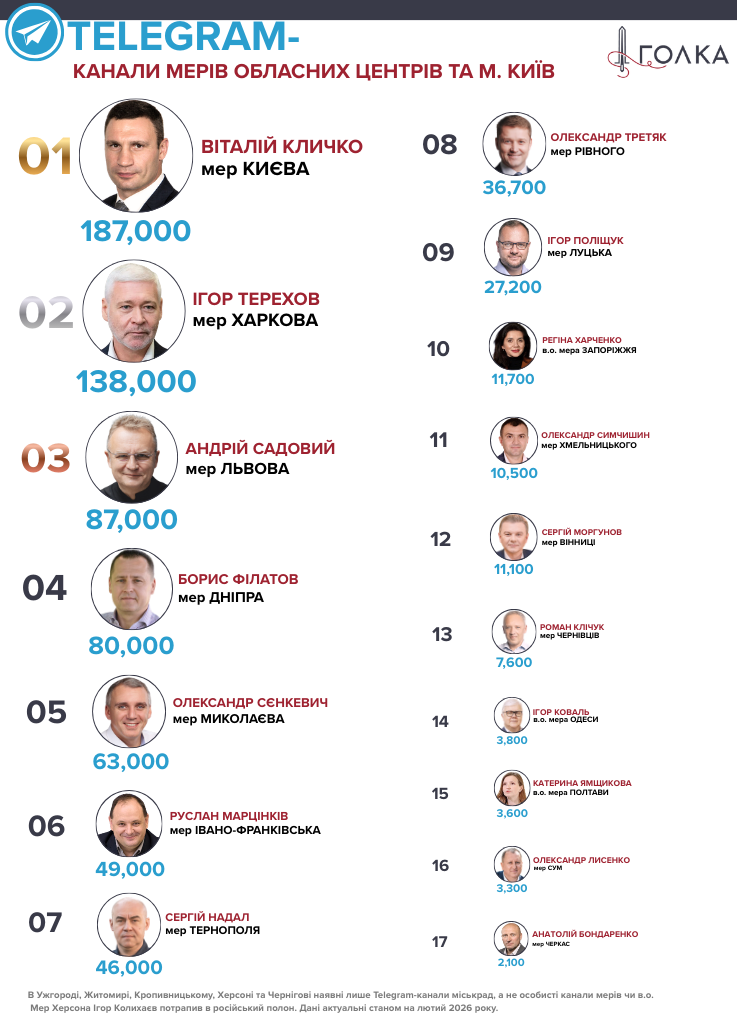 Для того, щоб розуміти масштаби залучення аудиторії і впливу можна просто порівняти кількість виборців, які віддали голоси за мерів міст обласних центрів та кількість їхніх підписників. Якщо дивитися на Telegram-канали мера Києва Віталія Кличка, мера Львова Андрія Садового чи мера Дніпра Бориса Філатова і порівняти кількість підписників із кількістю виборців, які віддали за них голоси у 2020 році, то кількість підписників буде меншою десь на 50%.