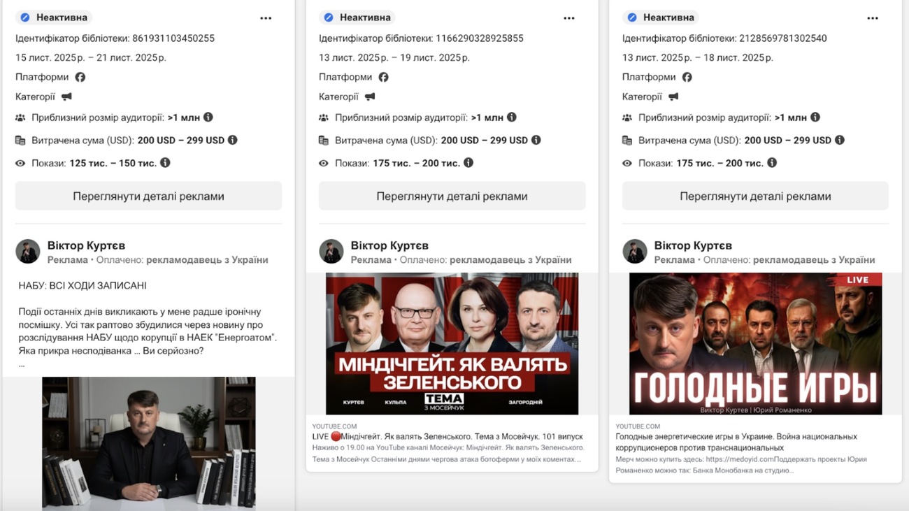 У 2025 році Куртєв витратив понад $13,8 тис. – більше ніж 0,5 млн грн – на просування власної сторінки та записів інтервʼю за його участі.