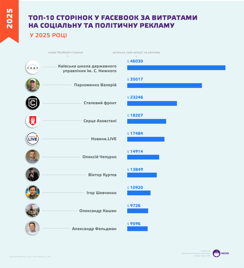 Загалом найбільше грошей минулоріч на рекламу у Facebook та Instagram, що стосується соціальних питань, виборів або політики, витратила Київська школа державного управління ім. С. Нижного. За даними бібліотеки реклами Meta, загальна сума склала понад $46 тис., тобто приблизно 1,9 млн грн. Організація активно просувала свої навчальні курси, як-от «Школу міністрів».