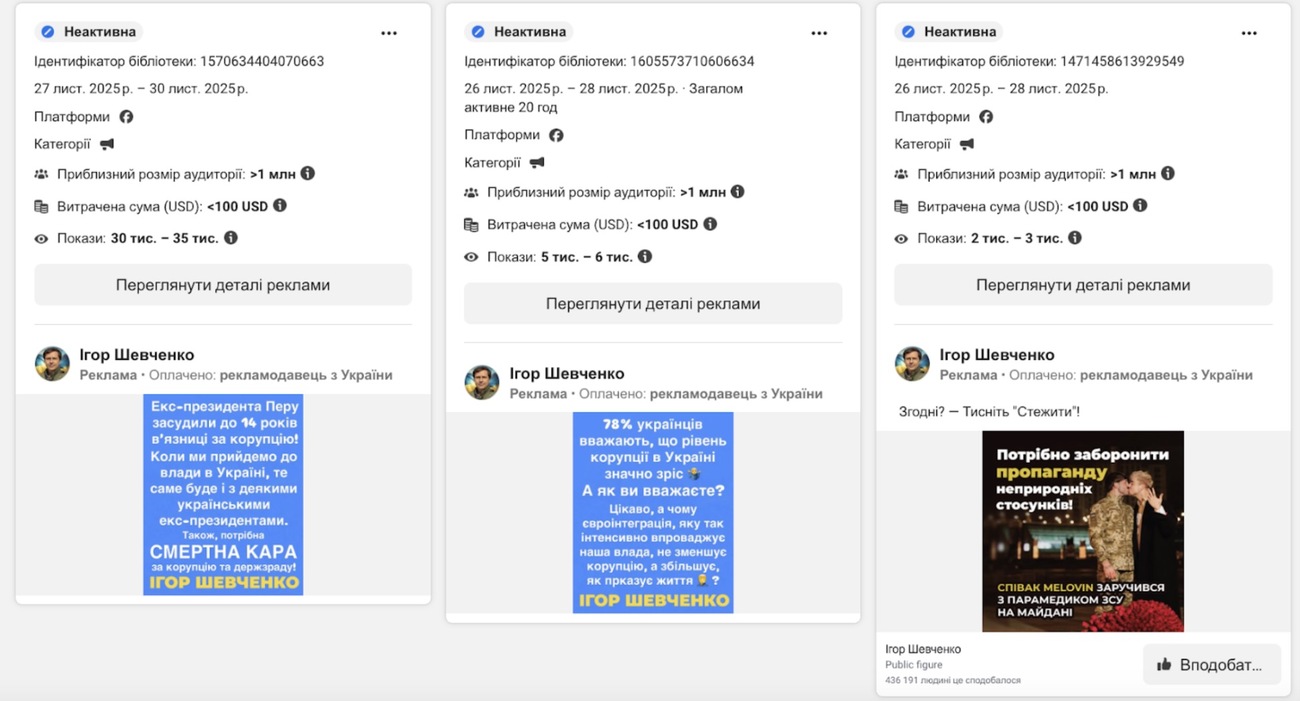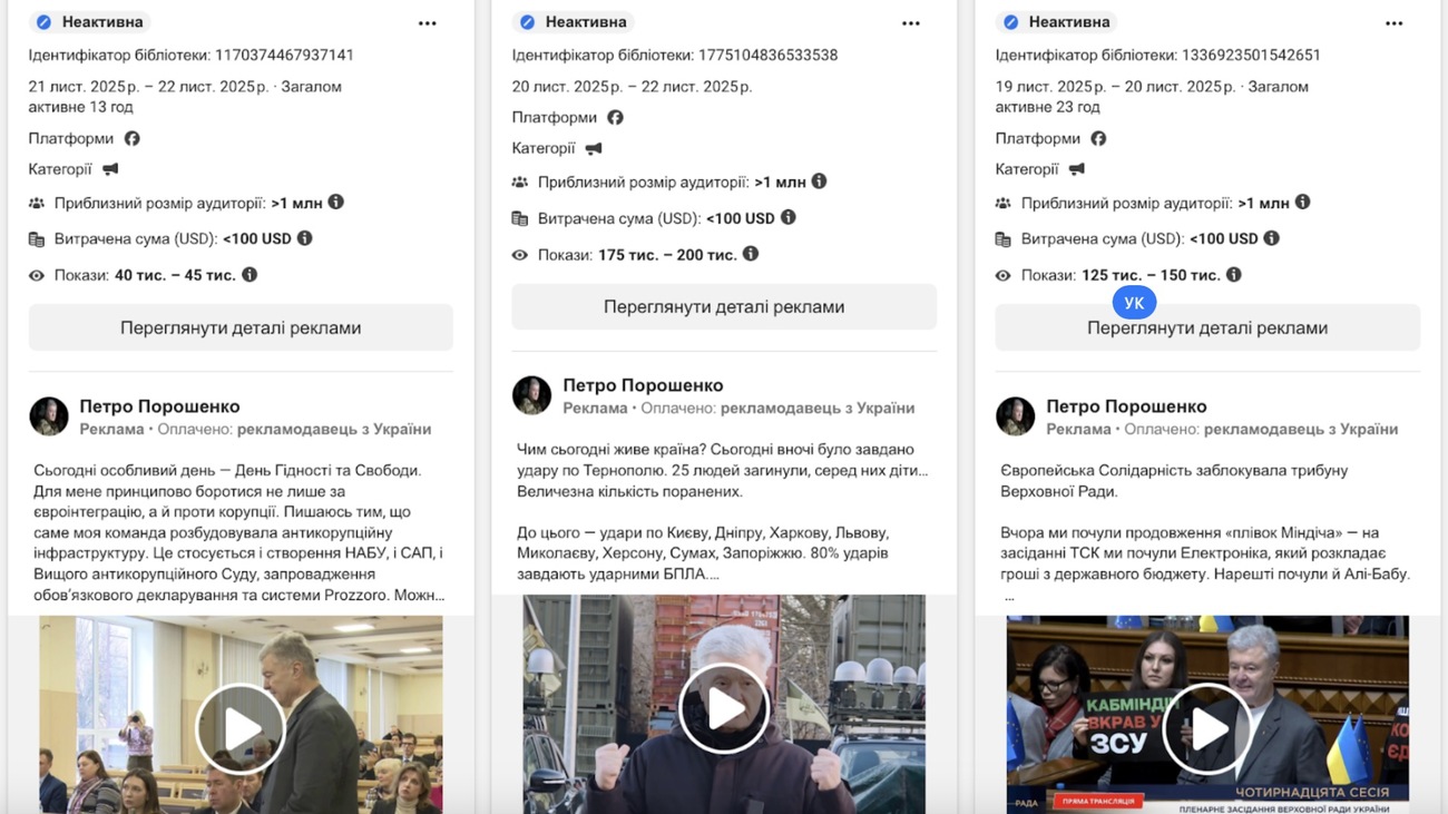 У 2025 році на політичну та соціальну рекламу українські сторінки в Facebook та Instagram, за даними бібліотеки реклами Meta, витратили понад 33 млн грн. Серед політиків на просування особистого блогу найбільше витратив перший заступник мера Полтави Валерій Пархоменко – орієнтовно 1,5 млн грн.