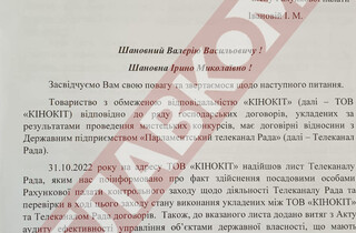 Окремо питання в аудиторів виникли щодо того, як ТОВ «Кінокіт» вдавалося виходити переможцем у конкурсах без інших учасників. Як з’ясувалося, у грудні 2021-го – І півріччі 2022 року телеканал «Рада» підписав із «Кінокотом» шість договорів на суму 92,6 млн грн. Це відбулося «за результатами внутрішніх мистецьких конкурсів».