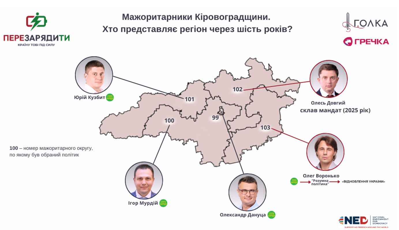 Кіровоградщину у Верховній Раді представляють троє народних депутатів мажоритарників із фракції «Слуга народу» – Олександр Дануца, Ігор Мурдій, Юрій Кузбит та один представник «Відновлення України» Олег Воронько.