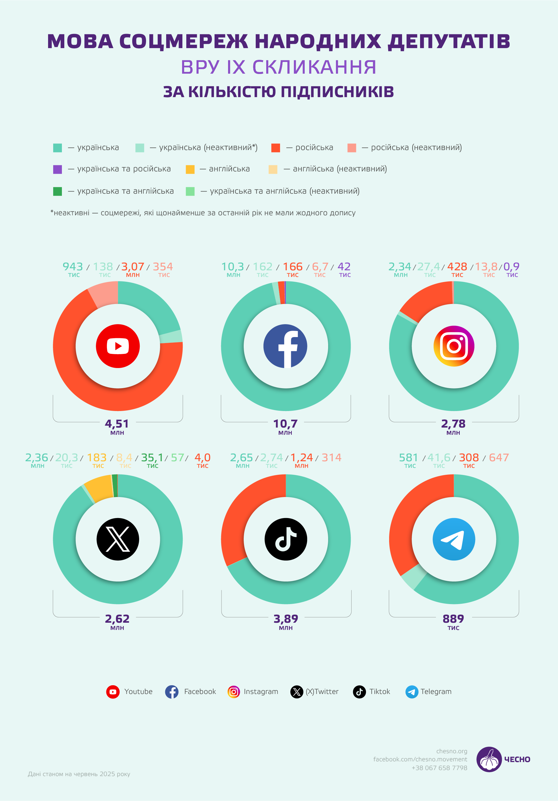 У чотирьох з шести проаналізованих соцмереж лідером за кількістю підписників виявилася «Європейська Солідарність» – попри те, що в парламенті вона представлена всього 27 депутатами. Лише в Instagram та TikTok «ЄС» поступається нардепам від «Слуги народу», що має найбільшу фракцію у Верховній Раді – 231 нардеп станом на початок липня цього року.