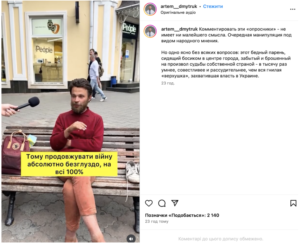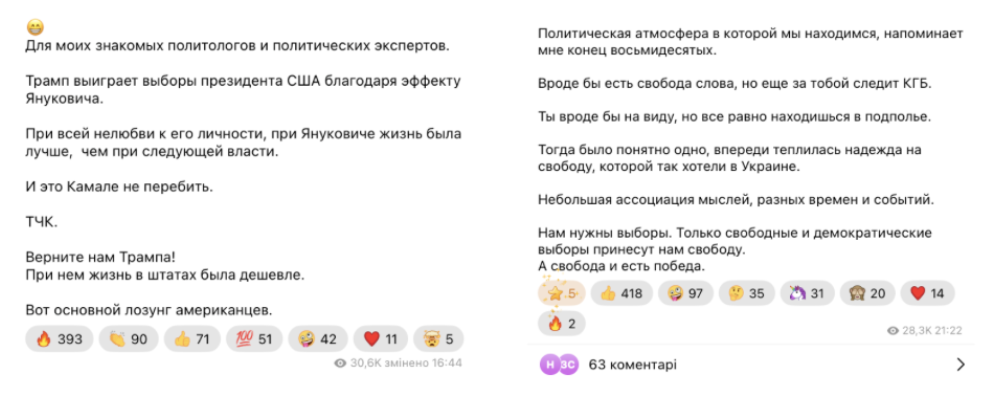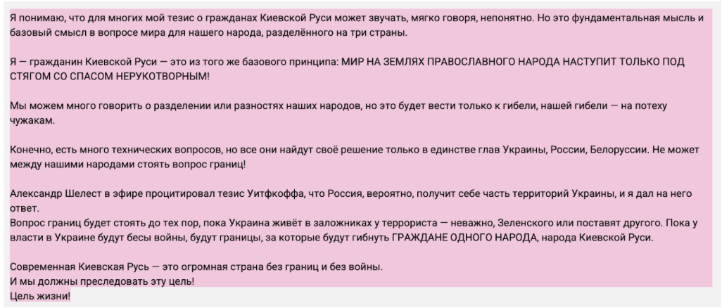 Інші популярні російськомовні Telegram-канали ведуть колишні представники більшості, а наразі депутати від групи «Відновлення України» – підсанкційний нардеп-втікач Артем Дмитрук і Євгеній Шевченко. Крім уже відомих наративів, Дмитрук додає ідеї про свою приналежність до «громадян Київської Русі» та виступає за відсутність кордонів між трьома народами – Росією, Україною та Білоруссю. Один такий допис може мати охоплення в понад 60 тис.