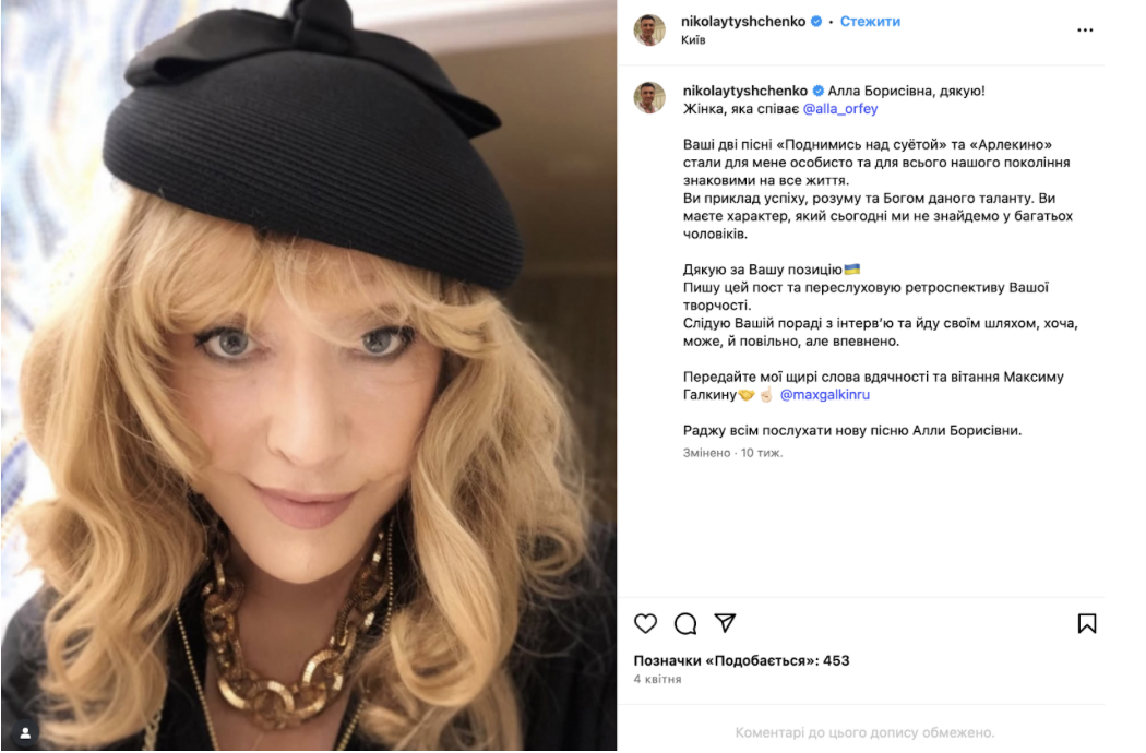 Зараз контент Тищенка орієнтований на публікації навколо благодійної діяльності та допомоги військовим. Щоправда, між цими дописами трапляються, наприклад, привітання Алли Пугачової з днем народження та згадки про її «знакові для всього нашого покоління» пісні.