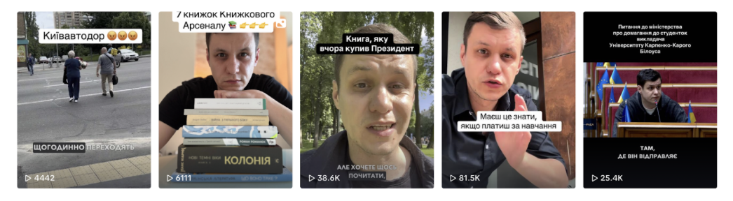 TikTok-сторінки активно ведуть 48 нардепів. Формати в більшості з них схожі: виступи з парламенту, відповіді на політичні запитання підписників і часом – трохи особистого. Наприклад, нардеп від «Слуги народу» Роман Грищук у своєму TikTok може ділитися сімейними моментами, розповідати про улюблені книжки та давати поради з повсякденного життя.
