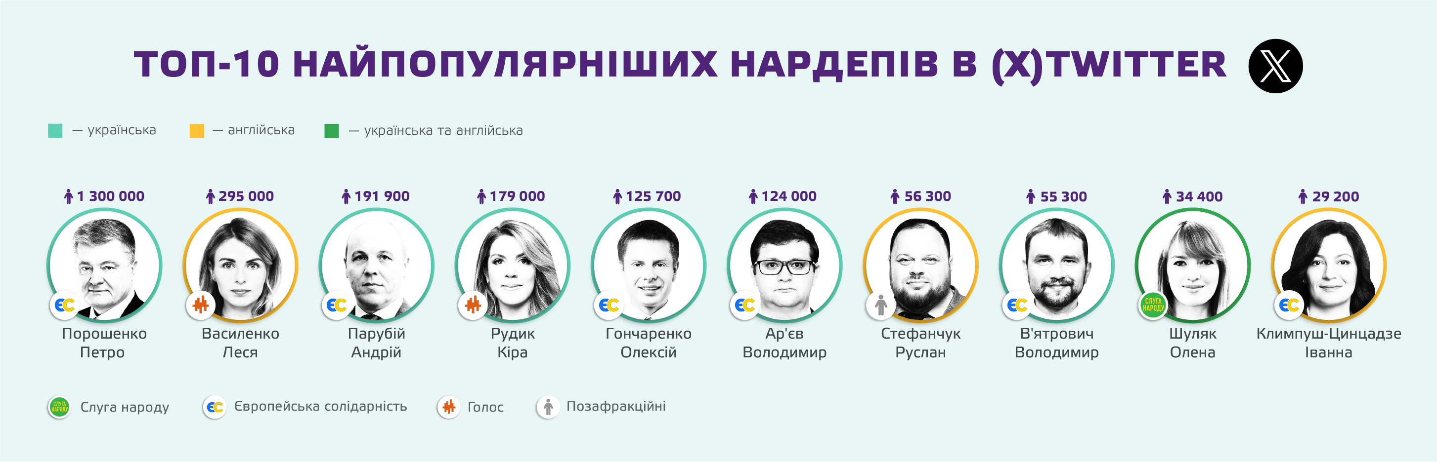 Єдиною платформою без жодного активного російськомовного акаунта серед нардепів виявився X (Twitter). Там обранці здебільшого комунікують українською чи англійською – переважно висвітлюють наслідки російських обстрілів і звертаються до міжнародної аудиторії.