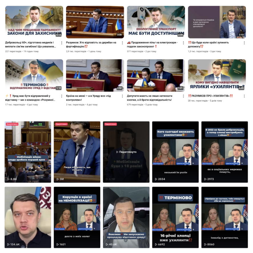 Ще один яскравий приклад – ексголова Верховної Ради, перший номер списку «Слуги народу», а наразі позафракційний лідер Міжфракційного депутатського об'єднання «Розумна політика» Дмитро Разумков. На своїй сторінці він регулярно публікує уривки з виступів у Раді, деякі з них зібрали понад 5 млн переглядів.