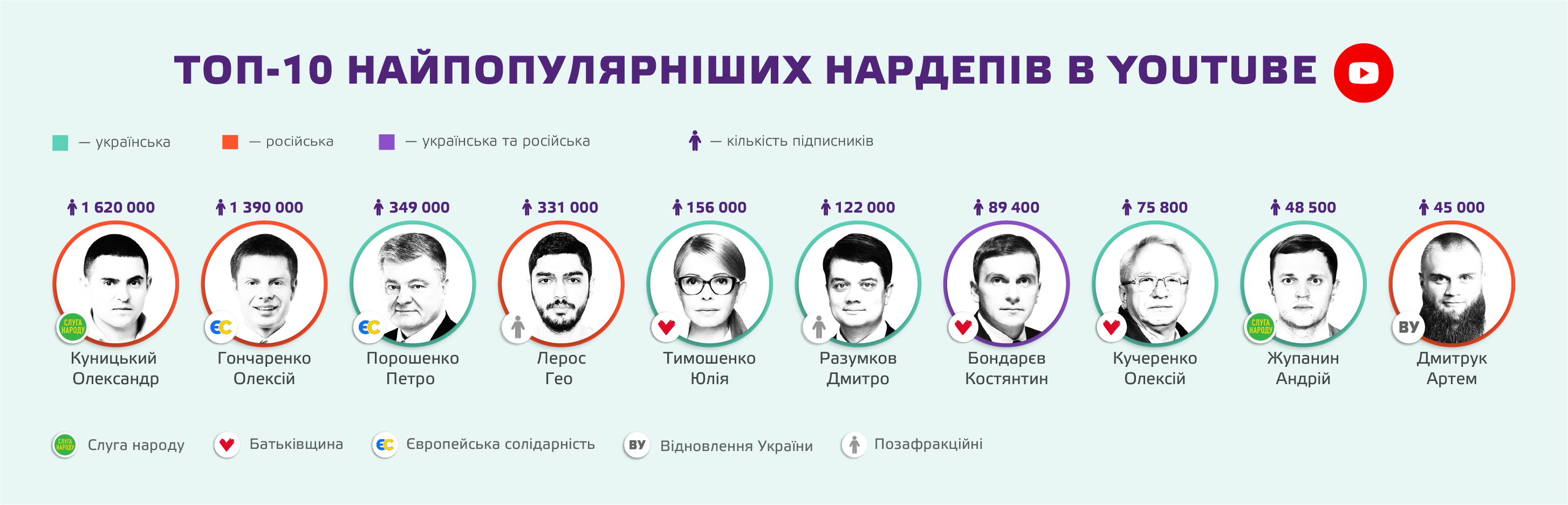 Гончаренко не єдиний, хто, попри війну, для блогу послуговується російською. Третина нардепів має YouTube-канали, серед яких 15 – російськомовні та більшість за останній рік не мали жодної публікації. Але загальна кількість підписників лише пʼятьох активних російськомовних сторінок налічує понад 3 млн. користувачів. Для порівняння – це втричі більше за суму всіх наявних україномовних каналів нардепів. А їх Рух «Чесно» знайшов у 122 обранців.