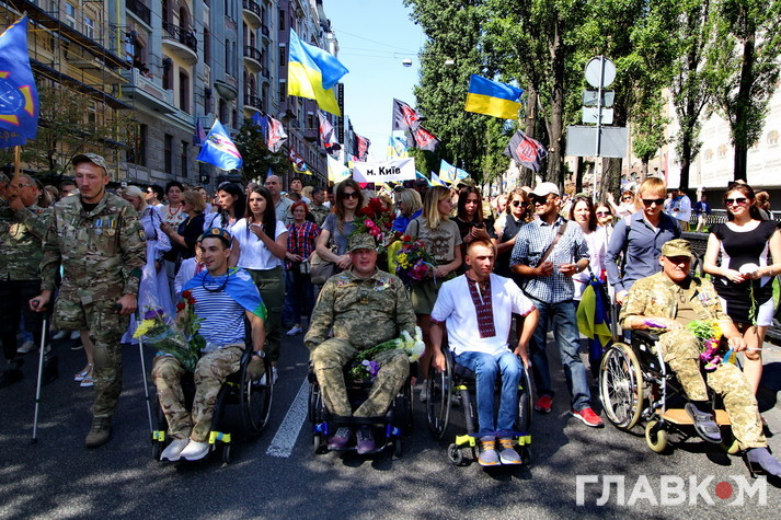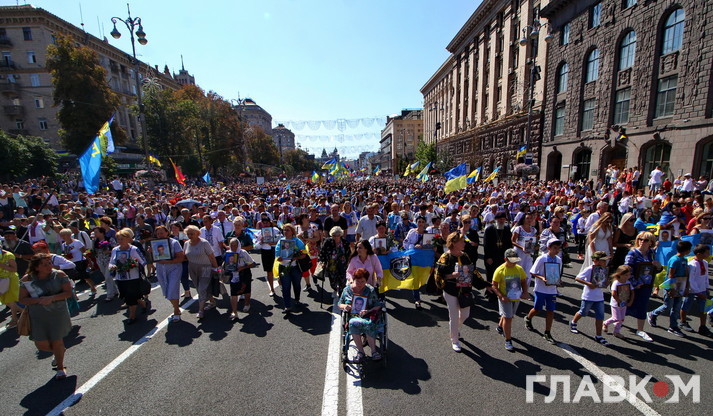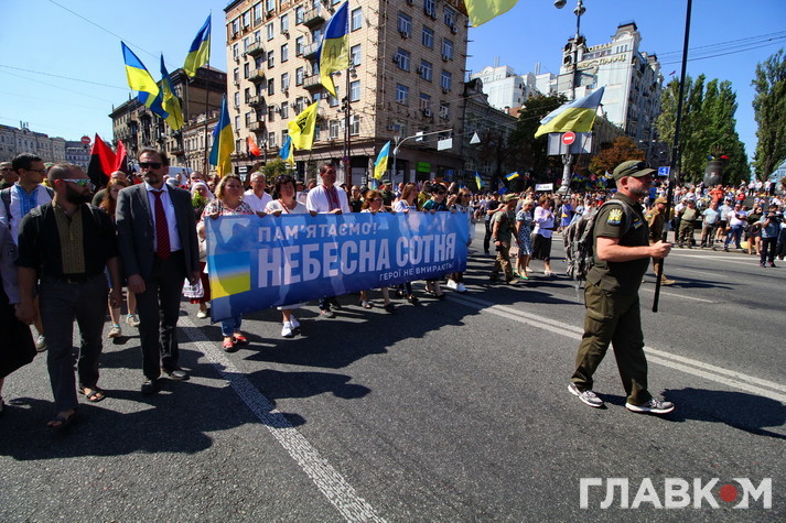Попереду колони, яка вирушила із запізненням на півгодини, йшли родичі загиблих у війні на Донбасі з портретами загиблих. Позаду них йшли ветерани АТО, розподілені по областях. «Дякуємо!», «Герої не вмирають, вмирають вороги!» – дехто із глядачів ставав на коліна. Іноді лунали відомі гасла про Путіна, та проривалось навіть «Смерть Російській Федерації!» З певними затримками колона через Хрещатик дісталася майдану, де частина ходи піднялась на алею Героїв Небесної Сотні, а частина прямувала до Михайлівського собору, де відбувся молебен за загиблими на війні.