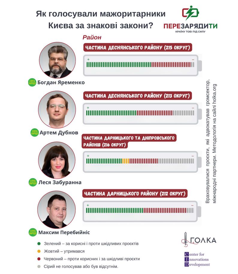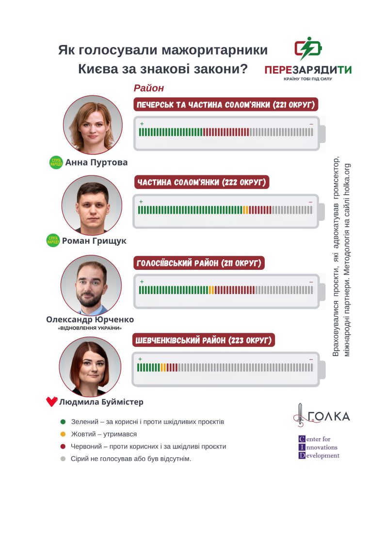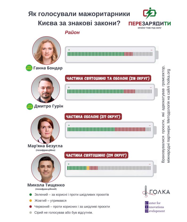 Так з 12 народних депутатів, які представляють зараз Київ і були обрані від партії «Слуга народу», троє чітко висловилися проти скандального закону, який позбавив Спеціальну антикорупційну прокуратуру та НАБУ незалежності – це Ганна Бондар, Роман Грищук та Дмитро Гурін. Вони представляють відповідно Поділ, Солом’янку, частину Святошина та Оболоні. Проти не проголосував жоден представник фракції «Слуга народу», який потрапив у парламент за спсиком. Важливо, що згадані троє народних депутатів-мажоритарників не підтримували також і скандальну містобудівну реформу (проєкт 5655) голови партії «Слуга народу» Олени Шуляк.
