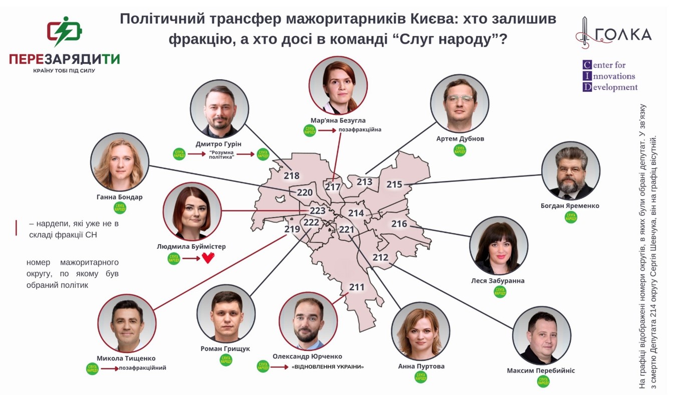 Із 13 нардепів столиці у фракції президента залишається семеро нардепів. У фракції більше немає Миколи Тищенка, Мар’яни Безуглої, Олександра Юрченка, Людмили Буймістер. Ще один мажоритарник, Сергій Швець, якого обрали у Дніпровському районі, помер через важку хворобу цього року.