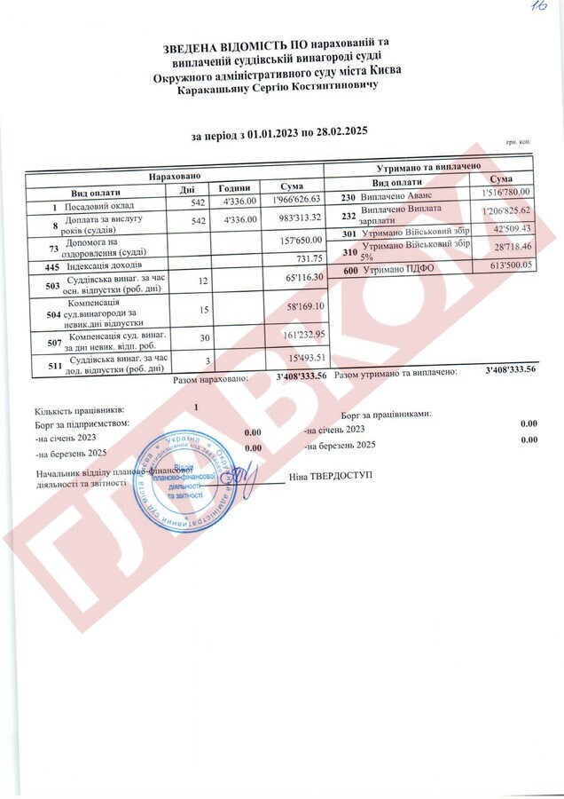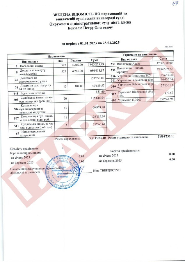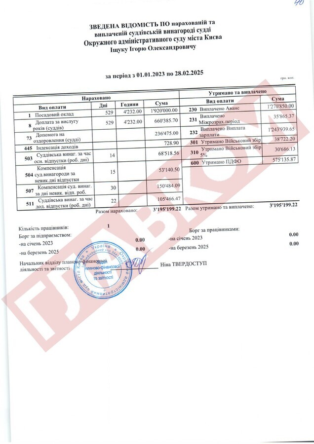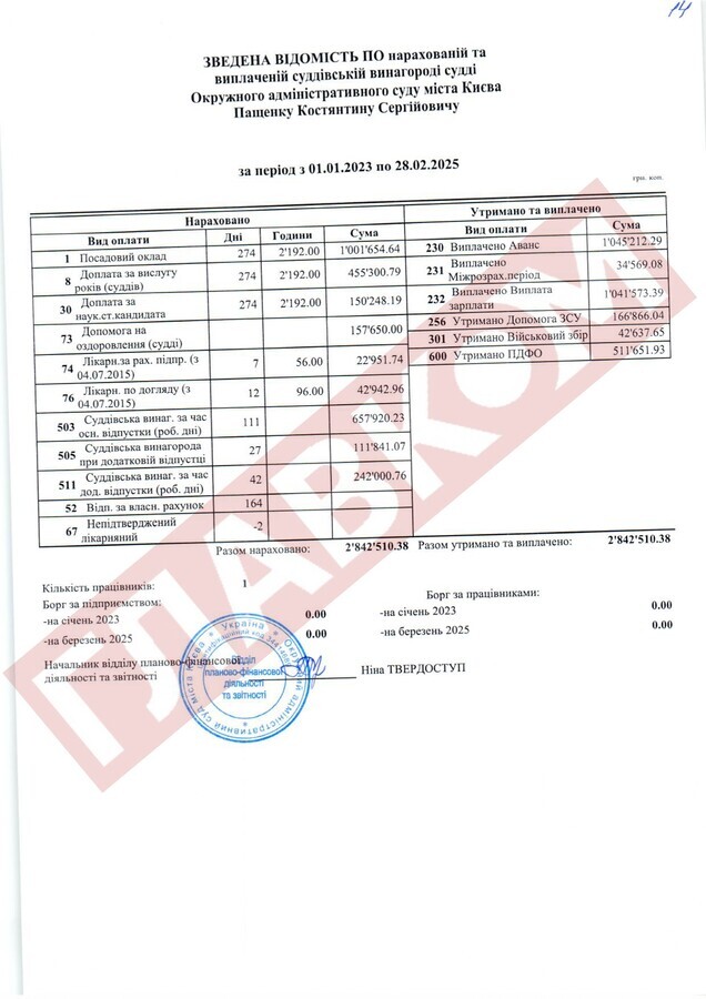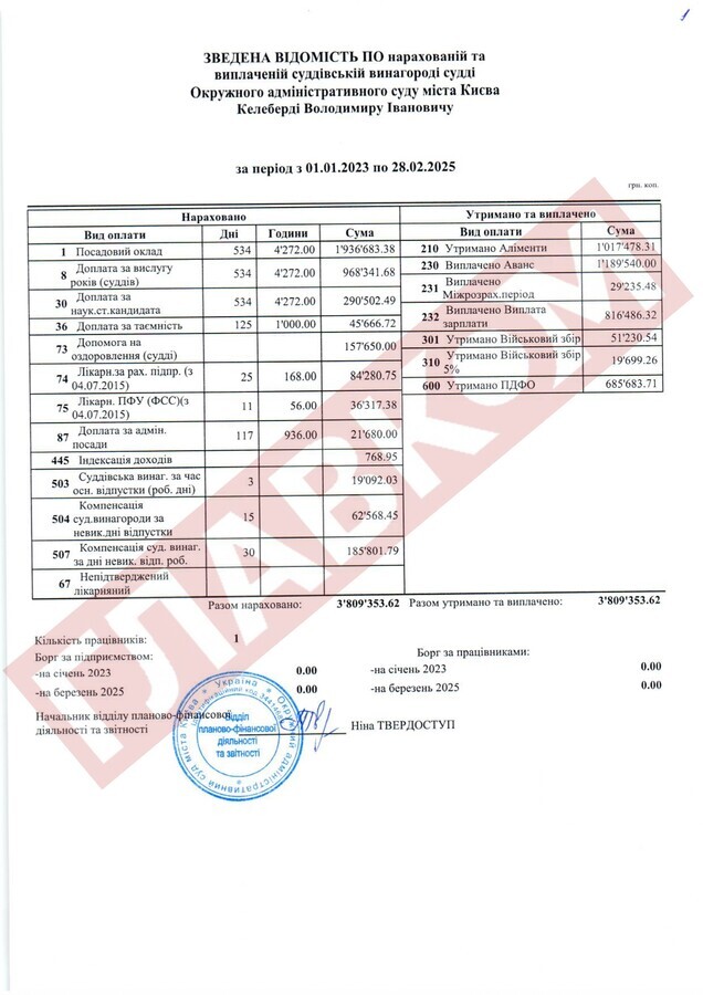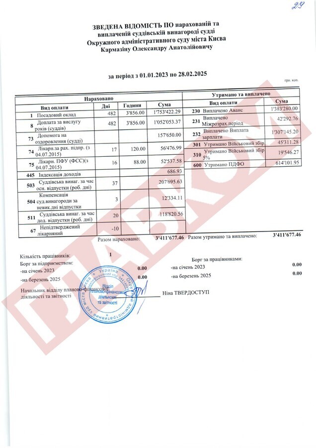 Справжнім рекордсменом за рівнем доходів із числа непрацюючих суддів ОАСК став Руслан Арсірій. На кінець лютого 2025 року сума виплаченої йому суддівської винагороди склала 4,66 млн грн! До слова, суддя Арсірій поки офіційно не звільнений.