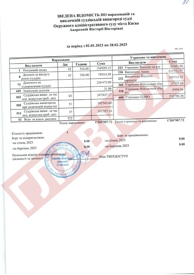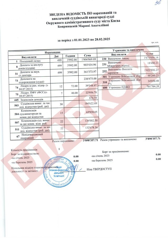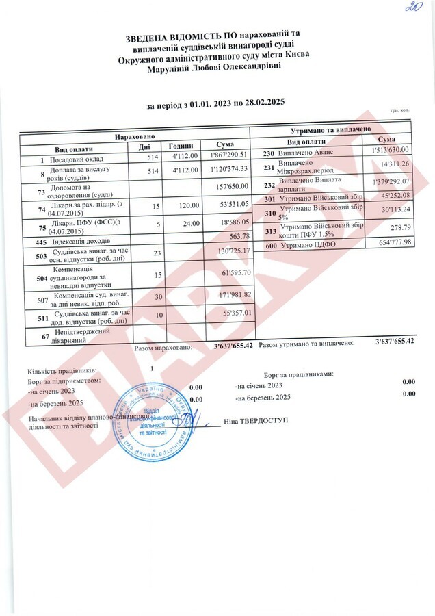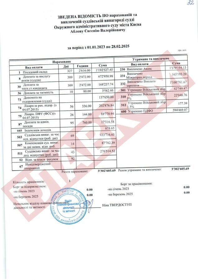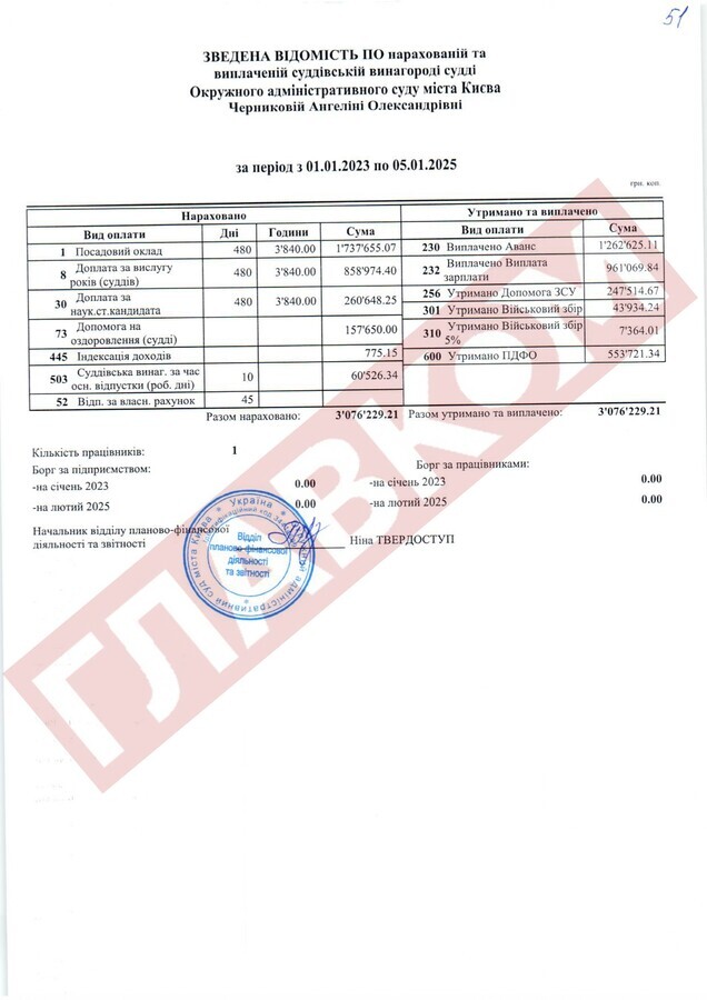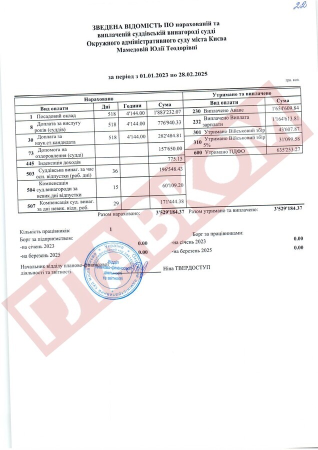 Колегу Вовка, яку ВРП відправила у відставку «за вчинення істотного дисциплінарного проступку», Альону Мазур також можна привітати. От дивіться: протягом 2023-го і до кінця лютого 2025 року екссуддя одержала 3,44 млн грн! У тому ж таки ліквідованому ОАСКу колишня суддя Мазур, наприклад, «поправила здоров’я» (офіційно стаття називається «допомога на оздоровлення судді») на 263,4 тис. грн.