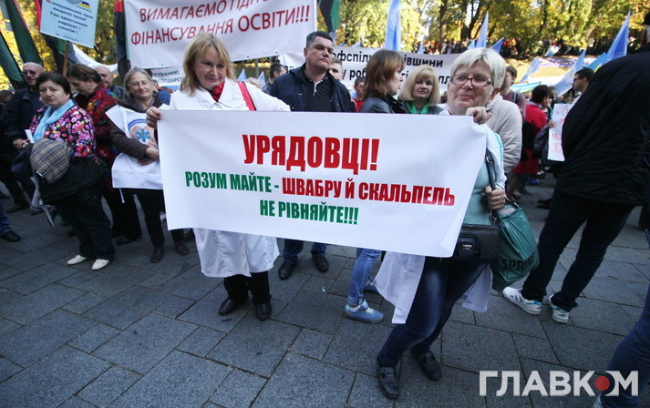 «Давайте перестанемо плакати біля цієї стіни плачу, давайте вимагати виконання наших вимог», - заявив один із спікерів на сцені, встановленій біля Кабміну. Нагодою «повимагати» тут же скористалися і народні депутати: Ольга Богомолець розкритикувала медичну реформу, а Сергій Каплін почав кликати «на килим» прем’єра Володимира Гройсмана, міністра соцполітики Андрія Реву і віце-прем’єра Павла Розенка.