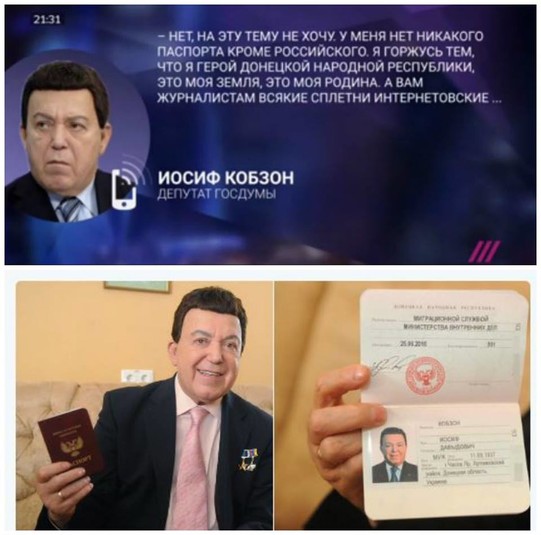 У своїй любові до російської влади та бажанні критикувати Україну він навіть відрікся від Батьківщини. Кобзон народився, виріс та отримав освіту в містечку на Донеччині. Так він відреагував на позбавлення його президентом Петром Порошенком державних нагород за підтримку агресії проти України: «Для мене не існує України. Для мене існує та Україна, в якій я народився, жив, яка мене нагороджувала. А це нувориші, маріонетки американські… Мені все одно абсолютно однаково».