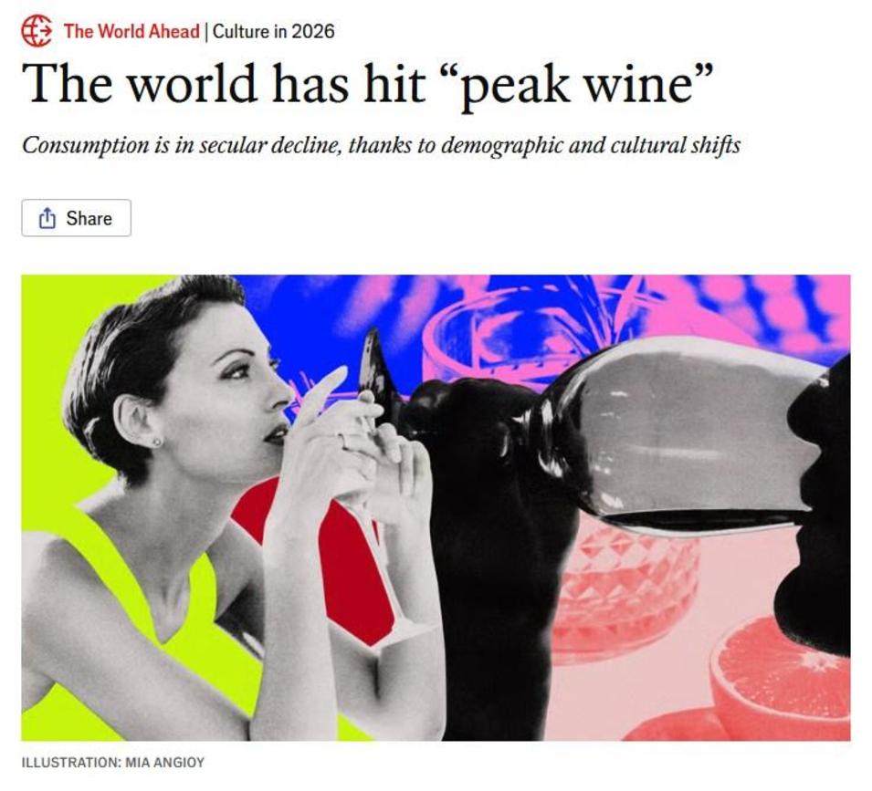 У листопаді 2025 року авторитетне видання The Economist опублікувало матеріал про те, що споживання вина надалі може йти лише на спад.