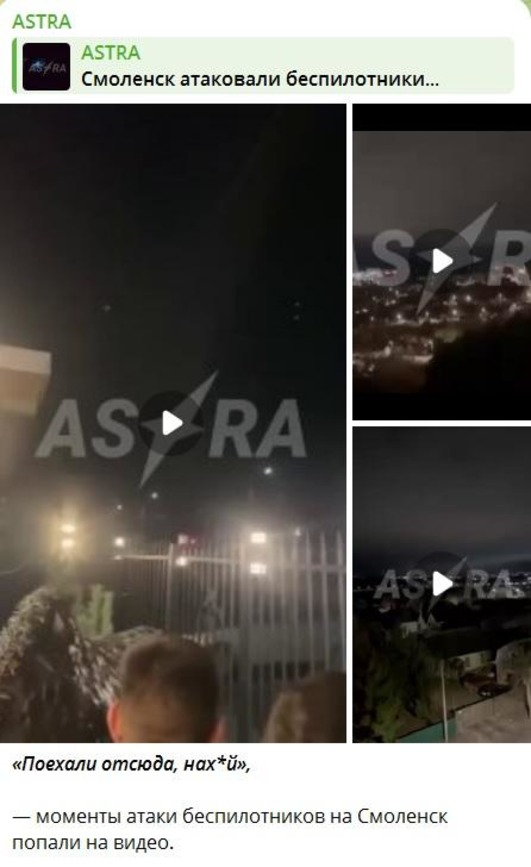 Та ж Astra поширює відео, де за кадром звучить голос очевидця, який спостерігає за пожежею, і в якийсь момент він закликає: «Поїхали звідси нах…й!». При цьому політ дронів над містом та їх потрапляння у ціль веселить місцевих мешканців – чути їхній регіт.