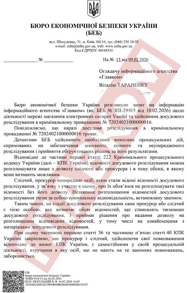 Станом 16 лютого 2026 року, у справі Vandal детективи БЕБ здійснюють необхідний комплекс процесуальних дій, спрямованих на забезпечення швидкого, повного та неупередженого розслідування і прийняття обґрунтованих рішень за його результатами.