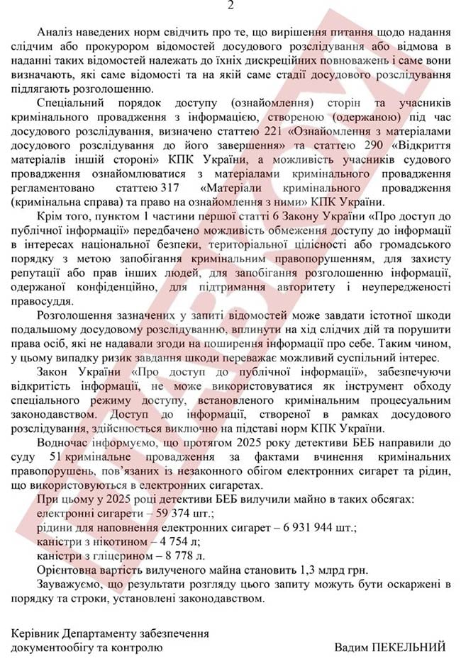 Нагадаємо, раніше «Главком» випустив серію матеріалів про мережу електронних сигарет Uvape. За версією правоохоронців, нелегальна продукція (нікотиновмісні суміші та рідини, що використовуються в електронних сигаретах) реалізовується через точки цієї роздрібної торгівлі на території України та і на вебресурсі Uvape. Влітку 2025 року БЕБ здійснило низку негласних слідчих дій у київських магазинах Uvape, провівши обшуки та вилучивши товар.