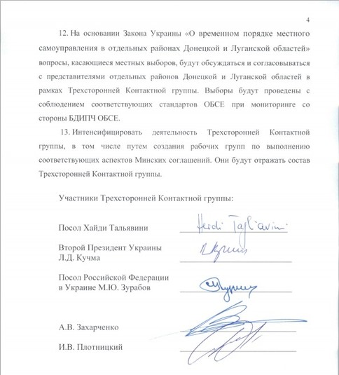 «Нормандська четвірка» у кінці червня 2014 року провела консультативні переговори телефоном. Наступна зустріч відбулася у Мілані 16-17 жовтня 2014 року. Їй передувала важлива подія: підписання контактною групою (уповноважена група представників України, ОБСЄ та Росії, яка була сформована як засіб для полегшення дипломатичного вирішення війни на сході України, - «Главком») Мінського протоколу (меморандум «Мінськ - 1») – угоди, що була досягнута на переговорах у Мінську 5 вересня 2014 року. Протокол був підписаний послом від Організації безпеки і співробітництва в Європі Гайді Тальявіні, від України - експрезидентом Леонідом Кучмою, від РФ - послом Росії в Україні Михайлом Зурабовим. Крім того, під Мінським протоколом поставили підписи ватажки терористичних організацій «ДНР» Олександр Захарченко та «ЛНР» Ігор Плотницький. Меморандум, зокрема, передбачав тимчасове припинення вогню на Донбасі і проведення виборів на окупованих територіях за українськими законами.