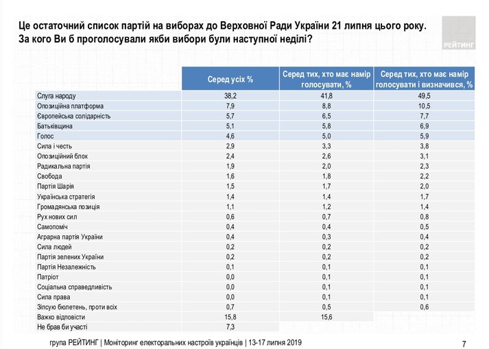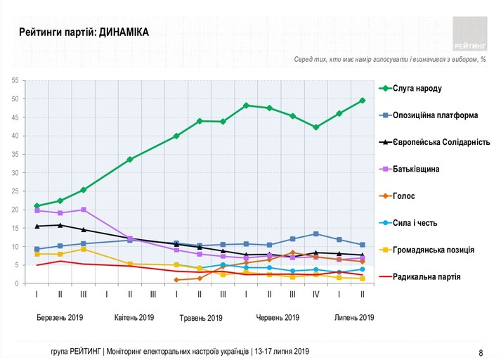 Лідером електоральних симпатій серед політичних сил є партія «Слуга народу», яку готові підтримати 49,5% тих, хто має намір голосувати і визначився з симпатіями. Також, наразі долають прохідний бар’єр партія «Опозиційна платформа – За життя» (10,5%), партія «Європейська Солідарність» (7,7%), «Батьківщина» (6,9%) та партія «Голос» (5,9%). Партію «Сила і честь» готові підтримати 3,8%, «Опозиційний блок» – 3,1%, Рейтинг інших політичних сил – менше 3%.