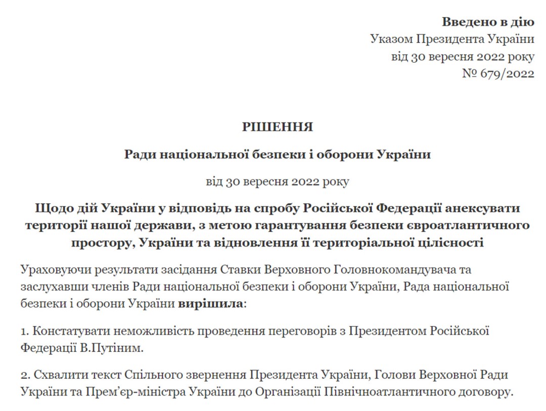 Та коли у кремлівського диктатора часом траплялися припливи миролюбності, він бідкався на те, що українська сторона сама унеможливила будь-який діалог з ним. Як великий знавець українського правового поля Путін полюбляє згадувати указ українського президента від 30 вересня 2022 року. Ним було запроваджено у дію рішення РНБО «Щодо дій України у відповідь на спробу Російської Федерації анексувати території нашої держави, з метою гарантування безпеки євроатлантичного простору, України та відновлення її територіальної цілісності». В першому пункті цього рішення йдеться про неможливість проведення переговорів з Путіним, якого офіційний Київ на той момент ще визнавав президентом РФ.