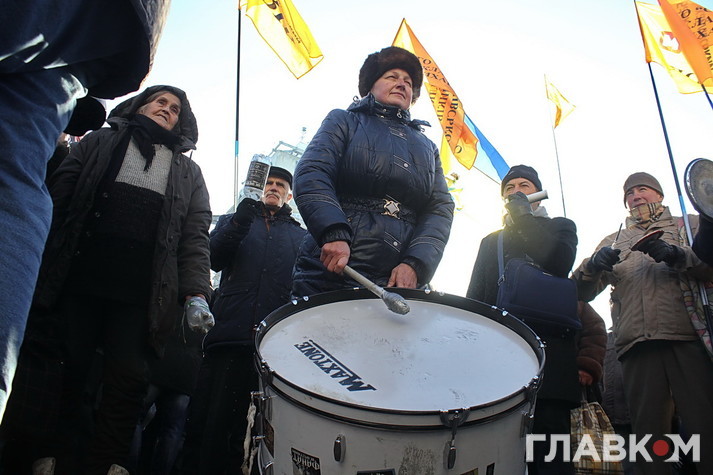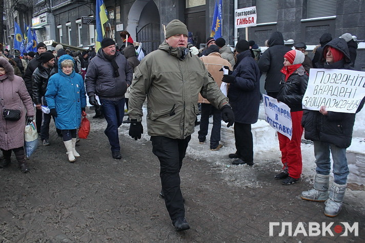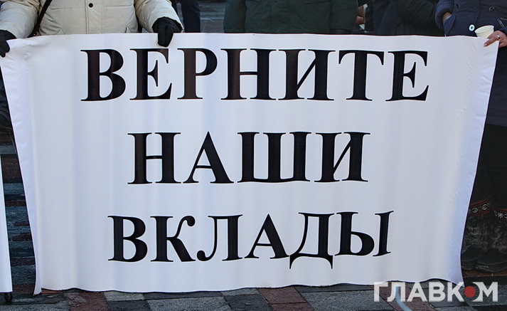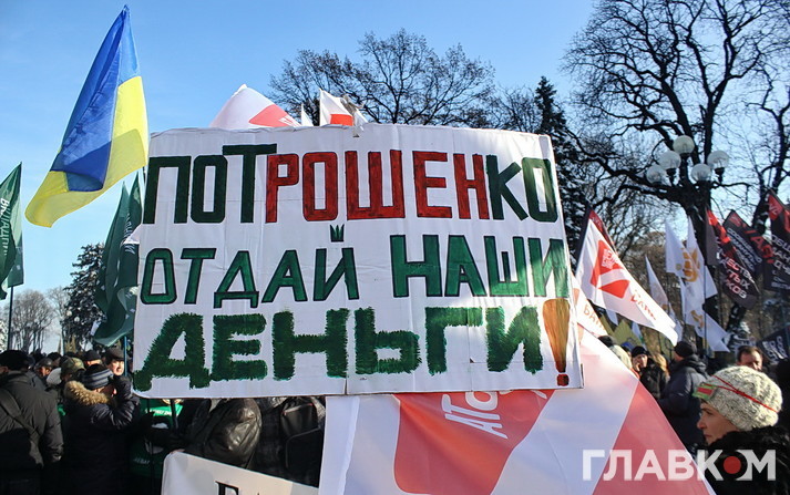 При чому, вкладники під ВР були представлені двома різними групами. Люди із блакитними прапорами з написом «Досить! Час дій!» під пісні «Океану Ельзи» та «Скрябіна» вишукувались у колонну «Мирна хода». Інші – із прапорами банків «Михайлівський», «Дельта», «АТ «Банк» («Фінанси і кредит». – «Главком») фікції та кидалово» – стукали у барабан та нестрункими голосами закликали Порошенка «віддати» їхні гроші, відправити Гонтареву «на нари», а «банду – геть». «Не потрібна ваша Європа. Нам трусів немає за що купити», – горланила щосили жіночка із намистом з кредиток на шиї.