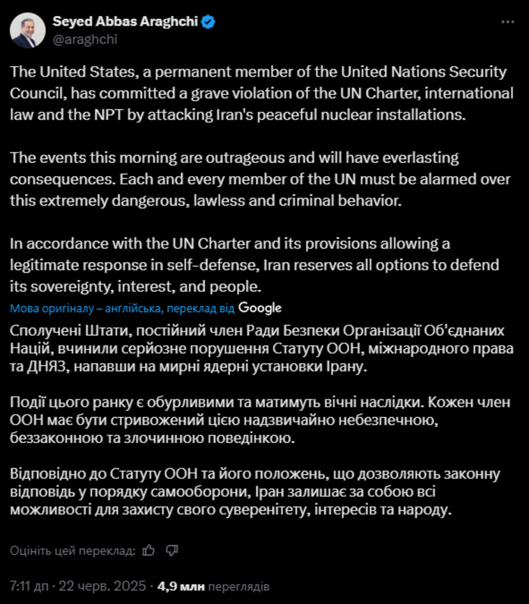 Американський президент Дональд Трамп відверто тріумфує: «Ми успішно завершили атаку на три ядерні об’єкти в Ірані (Фордо, Натанз та Ісфахан). Усі літаки вже залишили повітряний простір країни. Вітаю наших великих американських військових. У світі немає іншої армії, здатної на таке. Зараз – час миру», – додав президент США.