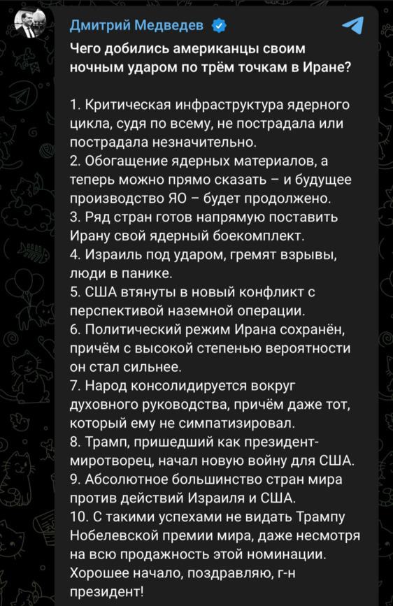 Ще один союзник Ірану, Росія, якій Іран допомагає «шахедами», що летять на українські міста, також вельми щедра на словесну підтримку. Заступник голови РНБО РФ Дмитро Медведєв розродився величезним дописом, у якому розкритикував Трампа і заявив, що удари США по Ірану тільки укріплять Іран і прискорять реалізацію його ядерної програми.