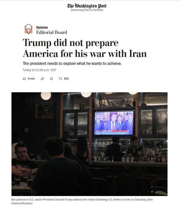 The Washington Post у своїй редакційній статті зауважує: втягнувши Сполучені Штати у війну з Іраном, до якої американські військові, схоже, були повністю готові, а решта країни – ні, Трамп не уточнив, яким же має бути «мир». «Чи то підтверджене зобов'язання Тегерана ніколи не прагнути отримати ядерну зброю? Чи то зміна режиму? Напередодні ударів президент закликав до «беззастережної капітуляції». Що, крім цього, задовольнило б його – і скільки американських ресурсів він би витратив, щоб цього досягти?», – розмірковують автори статті.