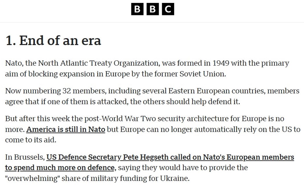 Ще більшою проблемою, ніж нерішучість НАТО, є розлад всередині Альянсу. Найбільший інвестор оборонного союзу США ставить ультиматум решті членів. Після Мюнхенської конференції з безпеки у 2025 році видання ВВС висловилось лаконічно: «Кінець епохи».