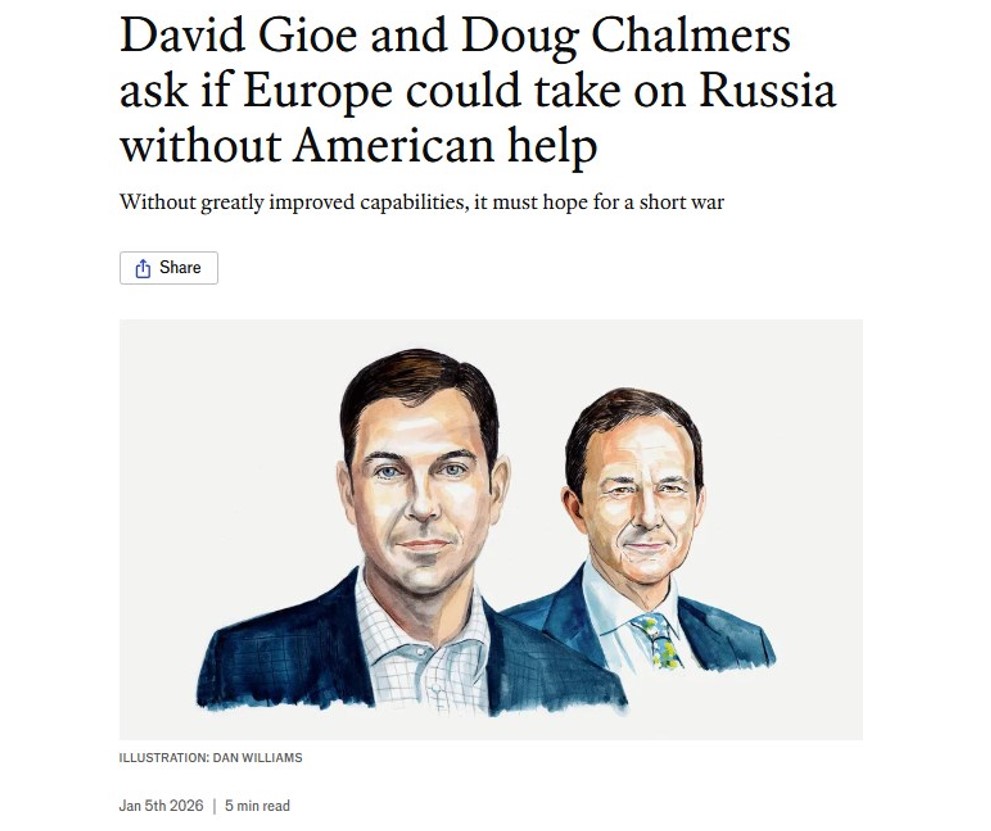 Песимістичний для Європи прогноз The New York Times – не єдиний. Професор кафедри воєнних досліджень Королівського коледжу Лондона, академічний директор Кембриджської ініціативи з безпеки Девід Джіо та ексзаступник начальника штабу оборони Великої Британії, викладач коледжу Еммануеля Кембриджського університету Даг Чалмерс на сторінках The Economist 5 січня 2026 року поділилися своїми прогнозами щодо того, чи зможе вистояти Європа проти РФ.