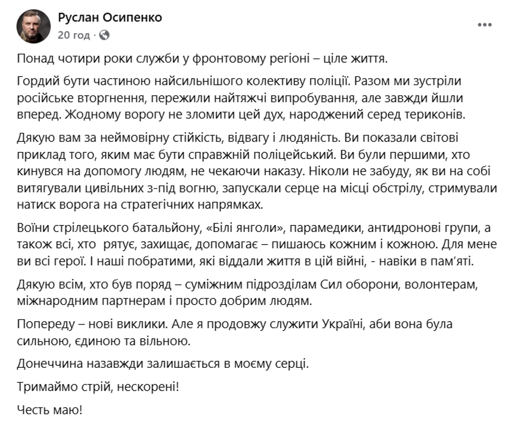 Після указу про призначення на Буковину Осипенко написав пост, в якому подякував колективу поліції, всім Силам оборони та заявив, що «Донеччина назавжди залишається в моєму серці».