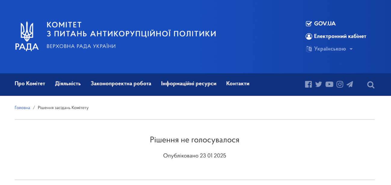 Водночас антикорупційний комітет у випадках, коли рішення не голосувалися на засіданні, прописує це на окремій сторінці. Це допомагає зрозуміти, що річ не в тому, що рішення забули опублікувати, а саме в тому, що на цьому конкретному засіданні комітет не ухвалював жодних рішень.