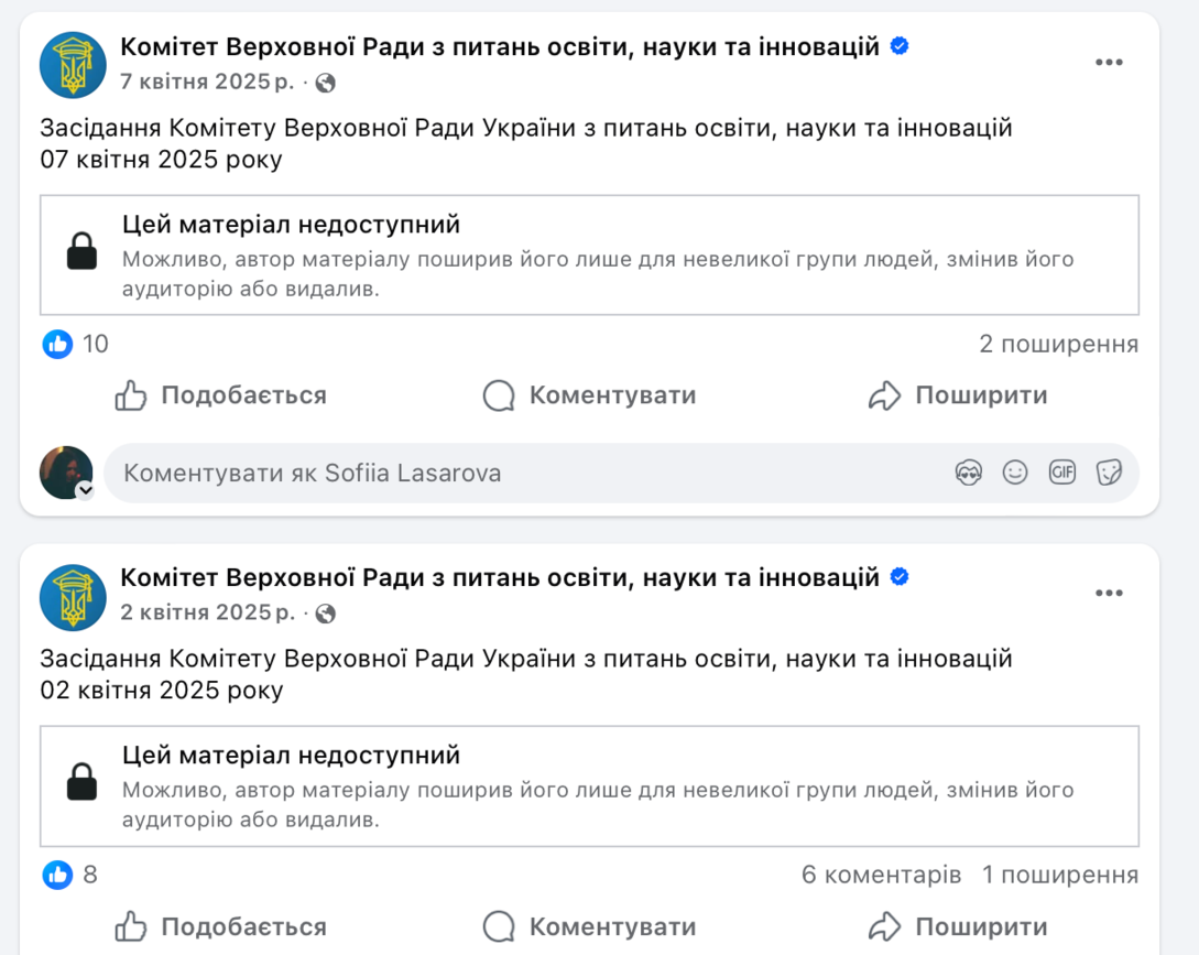 Крім того, зник доступ до 16 з 34 відео засідань комітету, які були опубліковані лише на Facebook – тепер їх неможливо переглянути. Торік у комітету ситуація була краща, він навіть значився серед лідерів рейтингу.