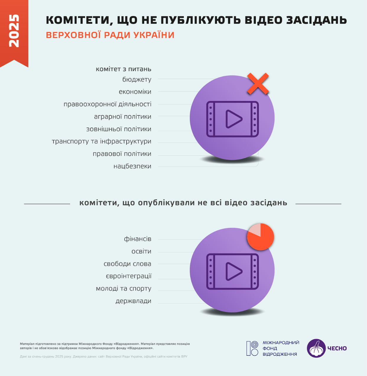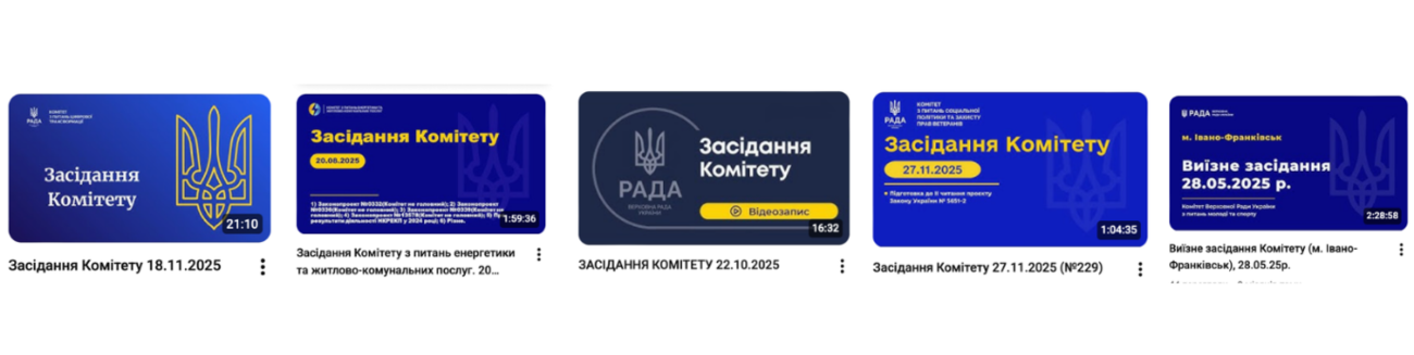 Усі комітети також мають на своїх сайтах спеціальний розділ для публікації відеозаписів. Лише п’ять комітетів наповнювали цей розділ протягом 2025 року. Але аж 15 почали це роботи з 2026 року після того, як набув чинності закон № 4212-IX. Водночас три комітети і досі не ведуть цей розділ (серед них – два закриті комітети, а також комітет з питань бюджету).