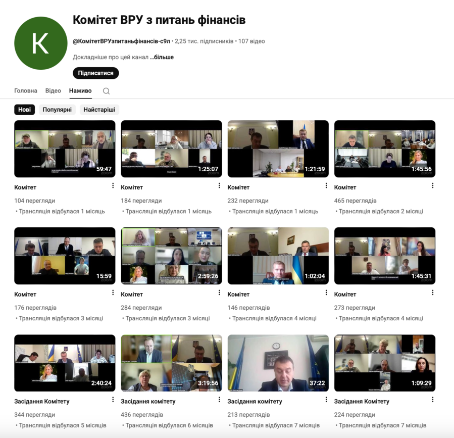 У 2025 році вісім комітетів взагалі не публікували відео своїх засідань. Раніше серед них також був Комітет з питань молоді та спорту, але в 2025 він поновив ведення YouTube-каналу і навіть заливає YouTube-shorts.