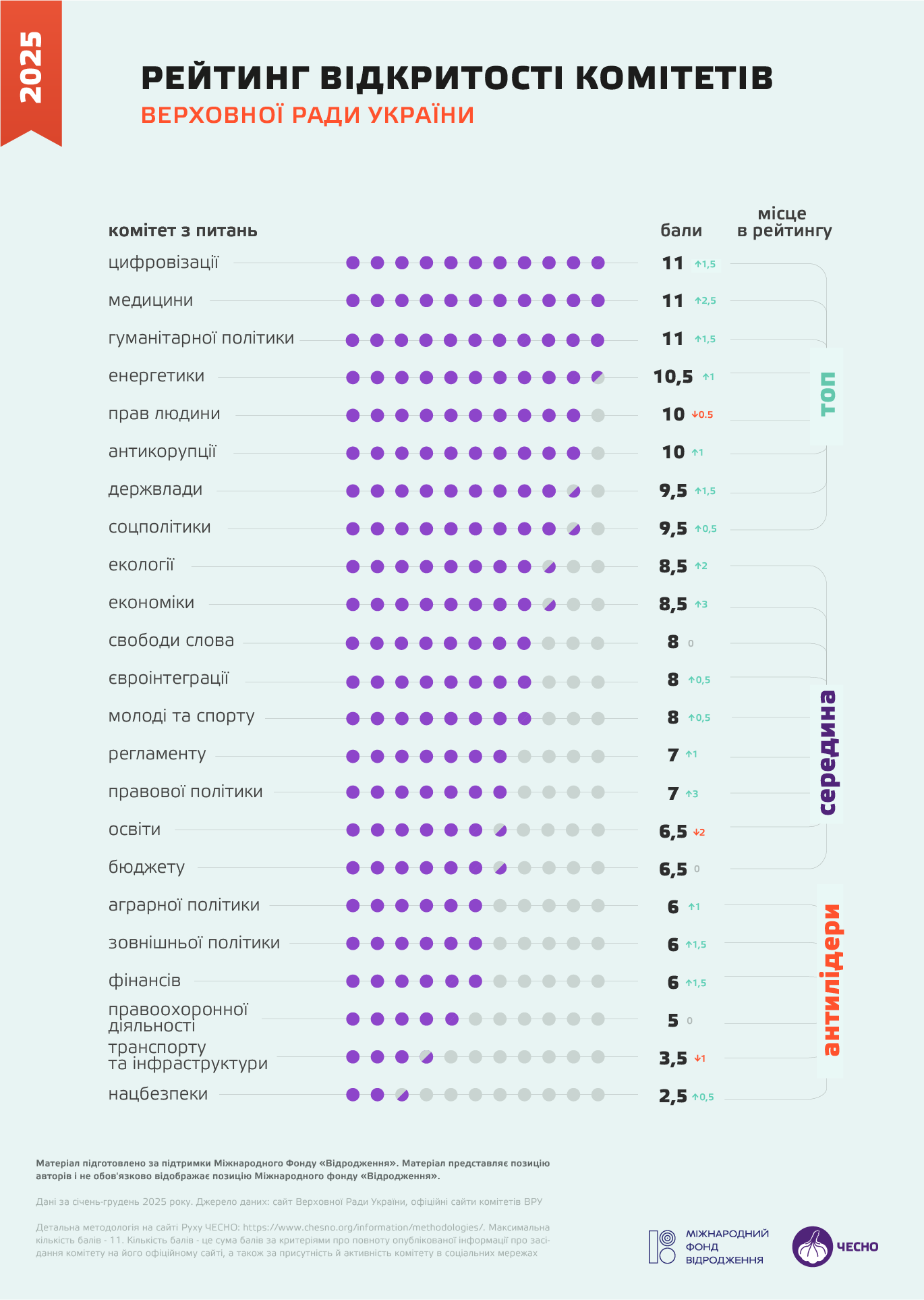 За підсумками 2025 року шість комітетів потрапили до антирейтингу, отримавши менш ніж половину балів за критеріями відкритості «Чесно». Торік таких було семеро.