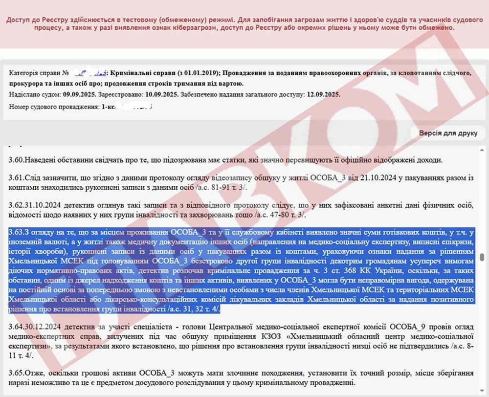 Події за «хабарним» епізодом розвивалися динамічно. У якийсь момент правоохоронці, вивчаючи журнал протоколу засідань МСЕК Хмельниччини, натрапили на фейкового інваліда. Ним виявилася жінка з II групою інвалідності, яку було оформлено у вересні 2024-го. Під час допиту вона повідомила, що не зверталася до установи Крупи за призначенням групи інвалідності.