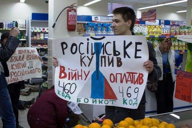 Активісти проводили театралізовані акції біля «Макдональдсів», де продавались вироблені в Росії соуси, біля мобільних кав’ярень, які розливають російські чаї, та закладів із російським капіталом – «Шоколадниці», «Кофе хаузу», «Євразії» (остання нещодавно «прославилась» масовим отруєнням відвідувачів). Лунали заклики бойкотувати російське кіно та концерти й вистави за участю російських виконавців.